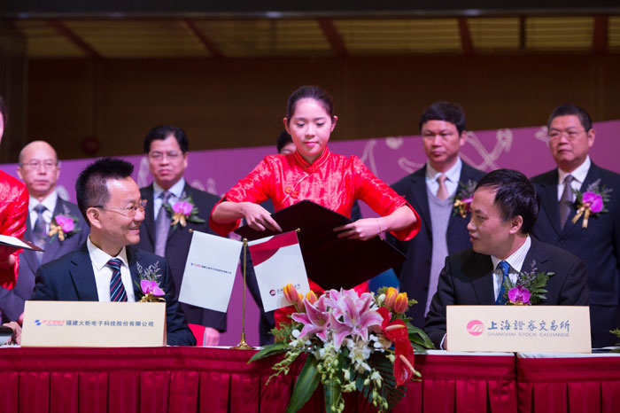 2015年1月26日,火炬电子A股上市挂牌仪式在上海证券交易所隆重举行。董事长蔡明通先生,总经理蔡劲军先生,董事会秘书、副总、财务总监郑平先生,常务副总陈婉霞女士等公司领导及省国防科技工业办公室主任谢超雄先生、泉州市副市长周真平女士等嘉宾出席仪式。
