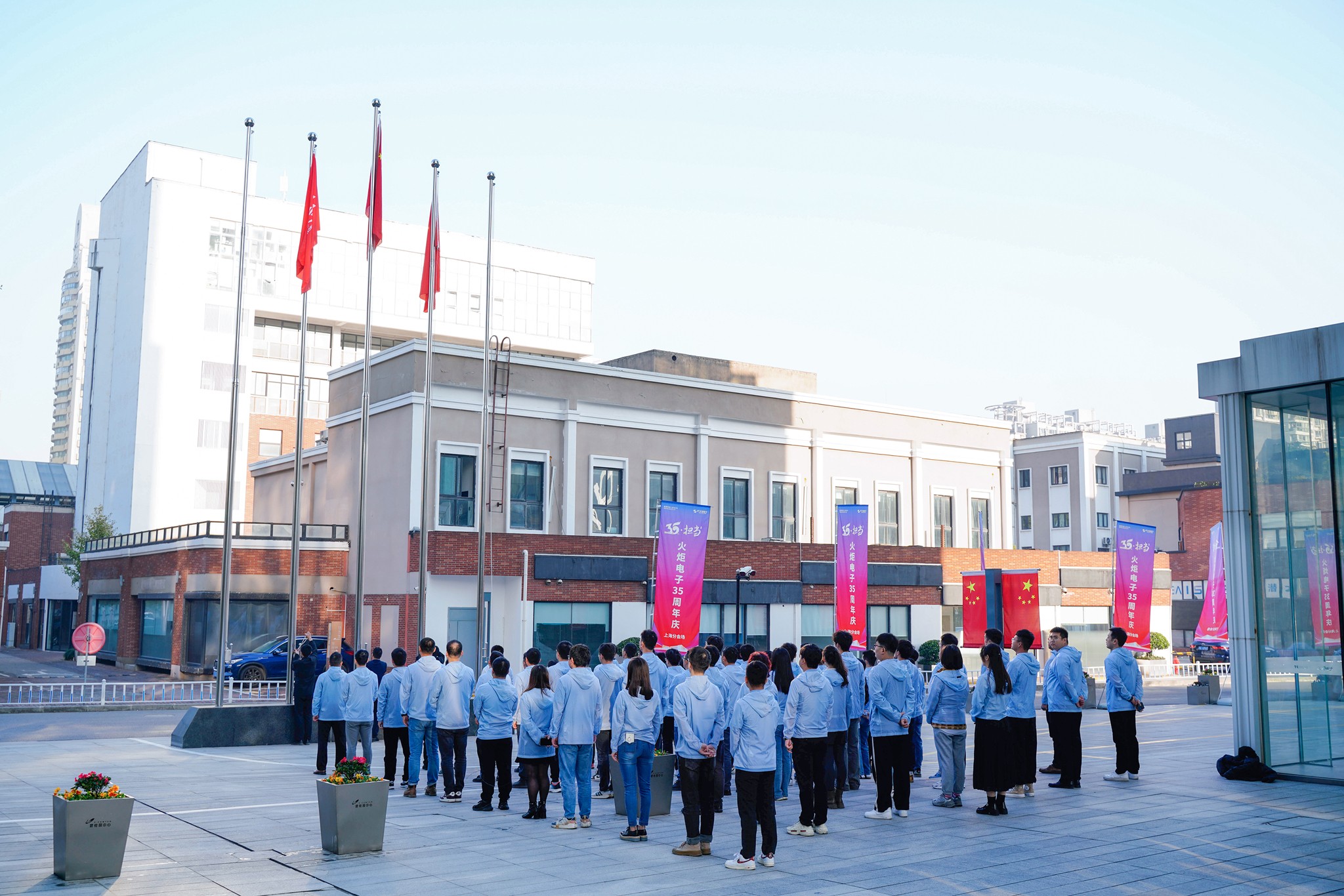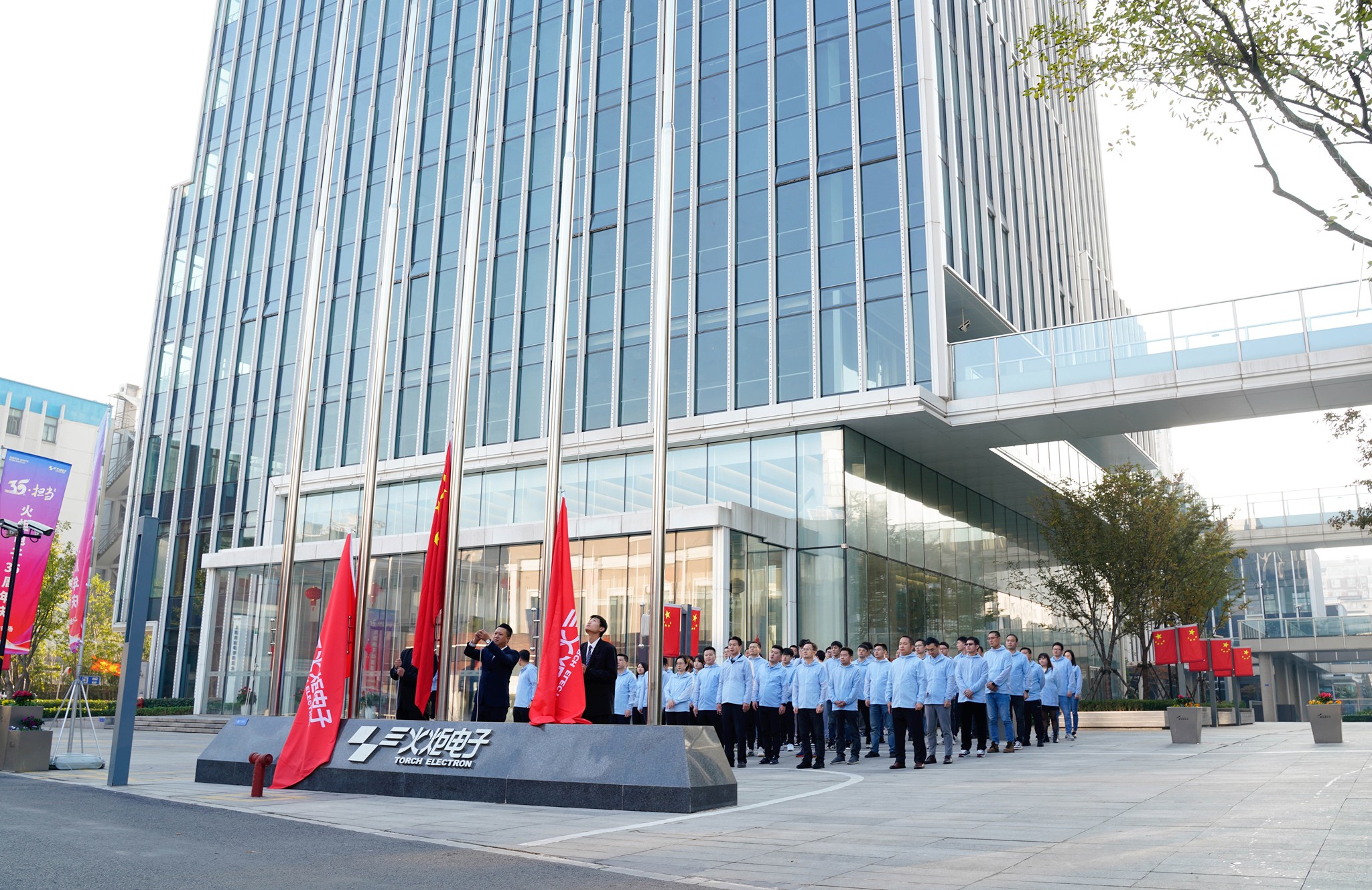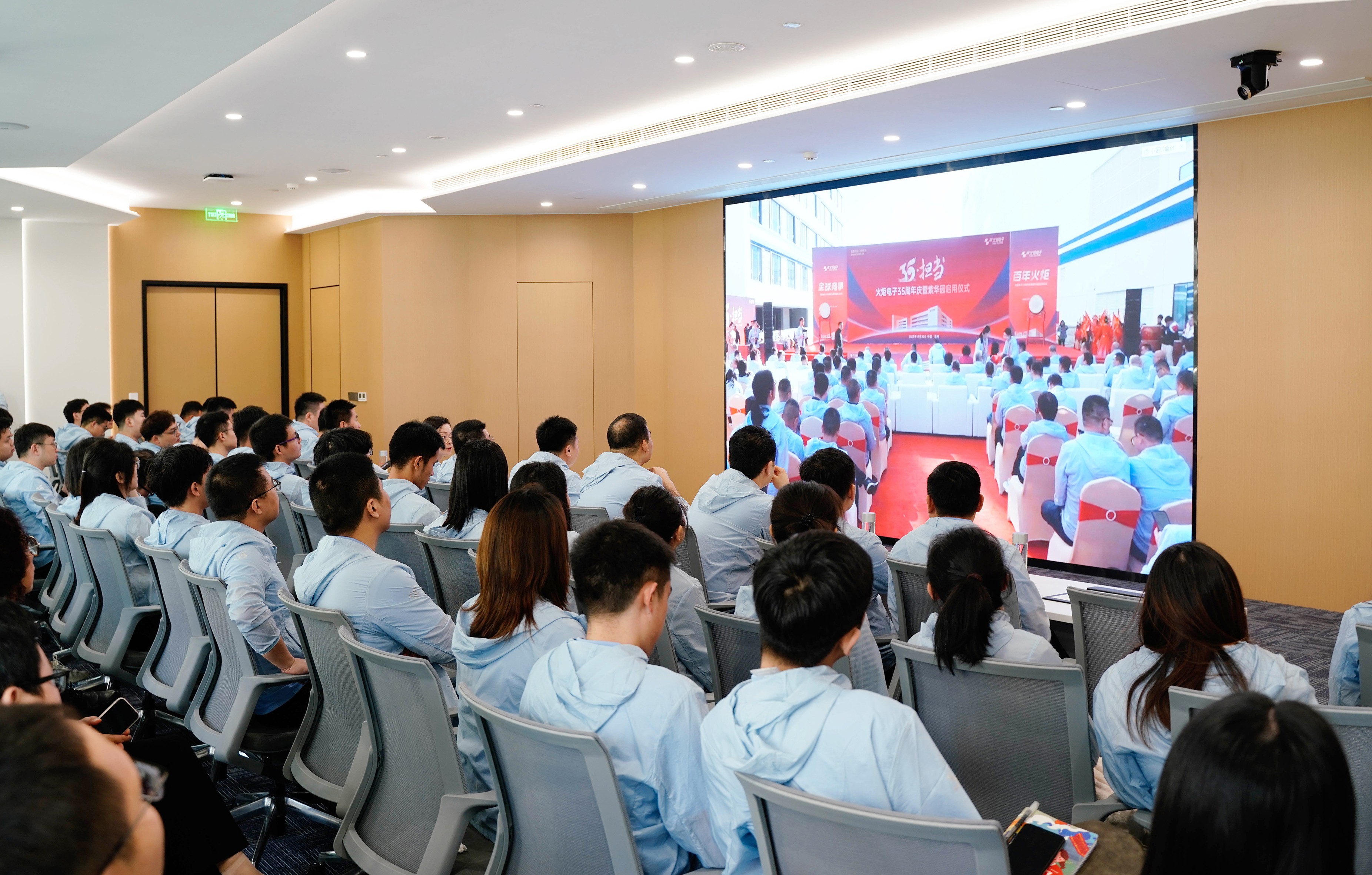 作为35周年庆的分会场,上海火炬电子集团大厦的旗台上五星红旗冉冉升起,对祖国的热爱、对行业的热爱,激荡在每个火炬人的心中。在庄严的升旗仪式后,分会场的参会人员齐聚上海火炬电子集团大厦三楼“全球厅”,“云参与”泉州紫华园启用仪式,见证火炬发展新篇章的启幕。